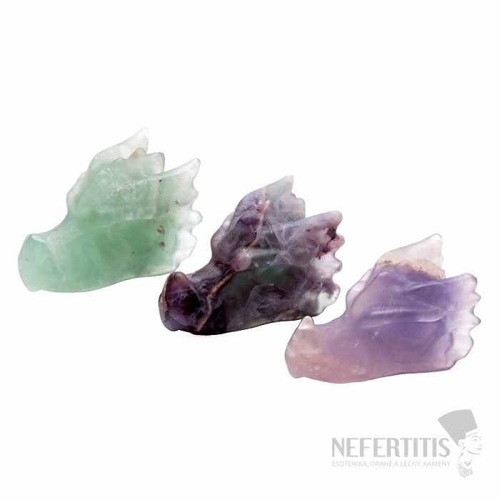 Hand-carved multicolor fluorite dragon head, elaborate in detail. Dimensions: approx. 3 x 5.3 cm (height x width). Illustrative image , individual products may differ from it mainly in color shade, structure and pattern of the stone and also in color from light green to deep purple. However, you will always receive a dragon head of comparable quality.