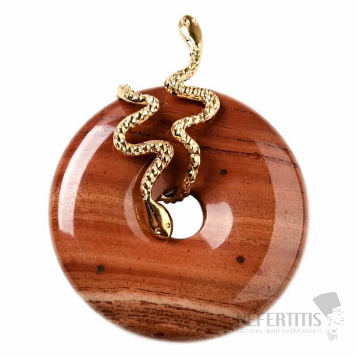Red jasper donut with gold-colored stainless steel snake. Donuts are suitable for wearing around the neck or in a pocket, or stuck to the body. They have strengthening effects on body and spirit. Illustrative image.
