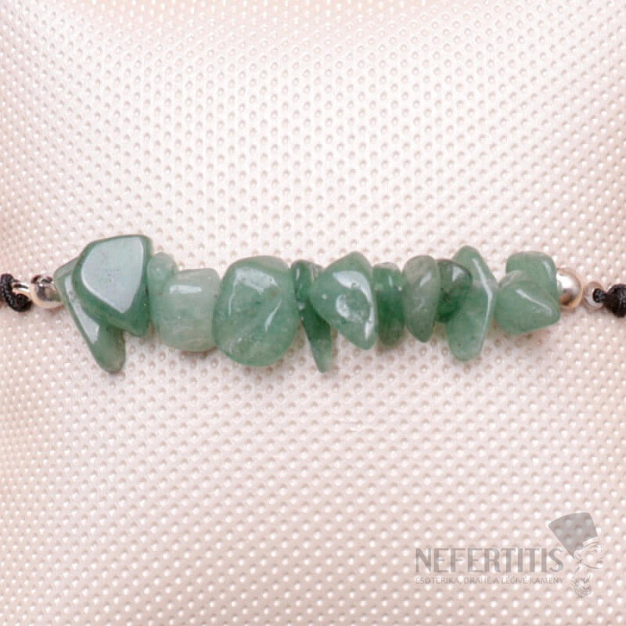 Attractive pull-down bracelet with polished pieces of aventurine. Black cord, base metal embellishments. Illustrative image. The bracelet is suitable for both women and men. Adjustable bracelet size with a sliding… more »