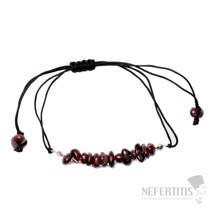 Attractive pull-down bracelet with polished garnet pieces. Black cord, base metal embellishments. Illustrative image. The bracelet is suitable for both women and men. Adjustable bracelet size with a sliding cord. The… more »