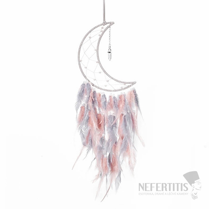 Dream catcher grey-pink Moon. Beautiful home decoration. The dream catcher is handmade, decorated with dyed feathers and plastic beads, with a double-sided synthetic white howlite crystal suspended from a base metal chain. This gentle dream catcher is especially suitable for a child's room. Length approx. 55 cm. Illustrative image.