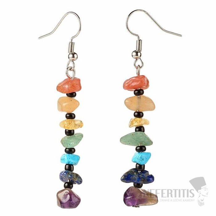 Attractive chakra earrings made of pieces of seven semi-precious stones in the colors of all chakras with glass seed beads harmonize and recharge the energy of the chakras, body and mind. Length including the so-called afro curtains approx. 6.2 cm (after hanging in the ear), the metal parts are made of base metal. Illustrative image, you are buying a natural material, individual earrings may differ slightly from the accompanying photos in terms of color shade and stone pattern, but you will always receive a piece of jewelry of comparable quality.