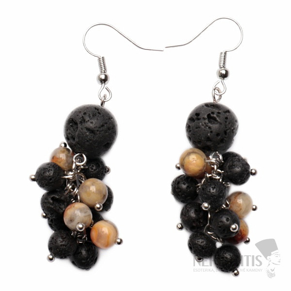 Attractive earrings with hanging beads of agate and lava stone. Length including the so-called afro curtains approx. 6 cm (after hanging in the ear), size of beads approx. 12 and 6 - 6.2 mm. The metal parts are made of base metal. Illustrative image, you are buying a natural material, individual earrings may differ slightly from the accompanying photos in terms of color shade and stone pattern.
