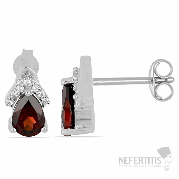 Exclusive silver earrings from the Nefertitis design line with cut natural garnets. The grenades are complemented by cubic zircons for an unmistakable shimmering look. The stones are set in rhodium-plated silver , the surface of which resembles the appearance of white gold, so the earrings give a luxurious impression. Rhodium-plated silver is less prone to surface oxidation (blackening). Beautiful glittering jewelry with clear stones of jewelery quality, whose beauty is emphasized by the impact of light on the individual surfaces of the cut, suitable for various occasions. The earrings have a snap closure. Rhodium plated silver Ag 925/1000, garnet approx. 1.7 carats. We deliver jewelry in a standard paper gift box. Illustrative illustration.