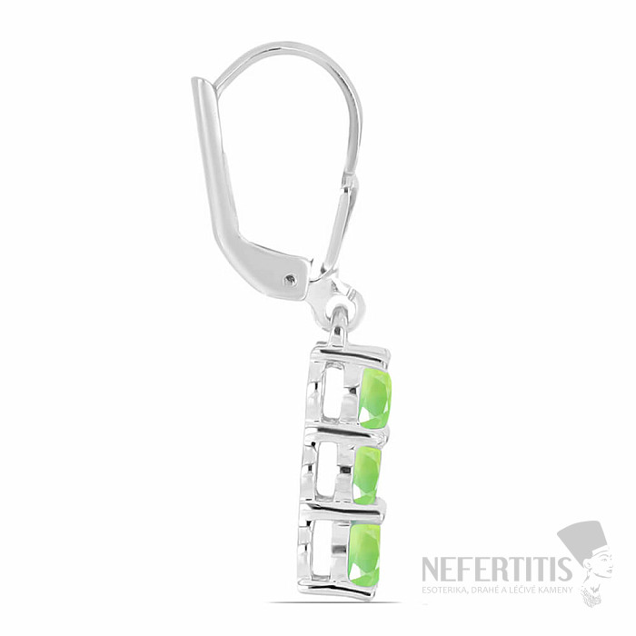 Exclusive silver earrings from the Nefertitis Collection design line with prehnite cabochons. The stones are set in rhodium-plated silver , the surface of which resembles the appearance of white gold, giving the earrings a luxurious impression. Rhodium-plated silver is less susceptible to oxidation (blackening) of the surface. Beautiful sparkling jewelry with clear jeweler-quality stones, the beauty of which is emphasized by the impact of light on the individual facets of the cut, suitable for various occasions. Rhodium-plated silver Ag 925/1000. Size of individual cabochons approx. 3.5 mm. Illustrative image.