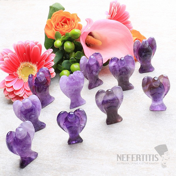 Guardian angel made of purple natural amethyst . The charming statuette of an angel made of carved and polished natural stone is not only a beautiful decoration, but also a protective talisman. The angel is a powerful symbol that expresses happiness and protection from all evil in life , it is a symbol of hope, enlightenment and guidance on the right path in life. More sizes. Illustrative illustration. The size, structure of the stone, drawing of the stone and color may vary slightly from piece to piece.
