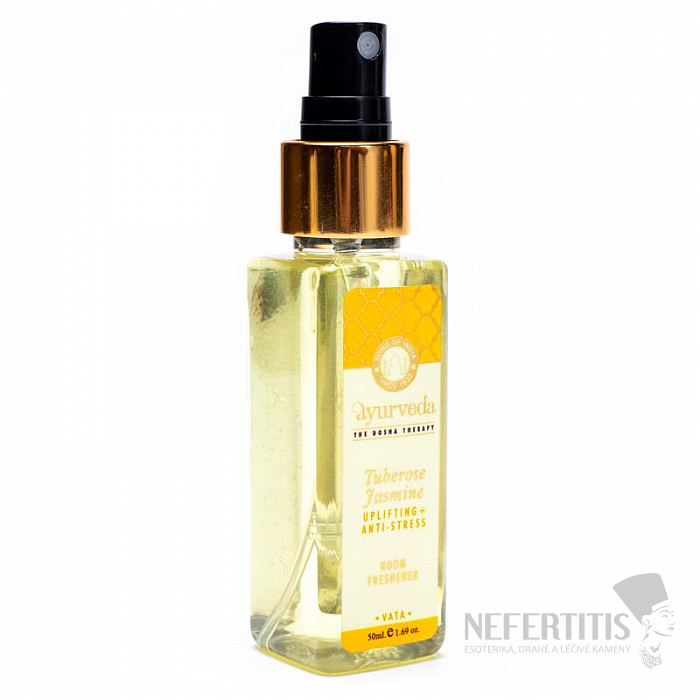 Premium fragrant home freshener Ayurveda Vata dosha with an aromatic scent of jasmine and white tuberose in a spray. A captivating scent that soothes your senses, refreshes the air and helps eliminate any unpleasant odor. The ideal scent for not only for your home - bedroom, living area and bathroom, but also for the car or your workplace. Concentrated freshener with a long service life. Content 50 ml, spray bottle.