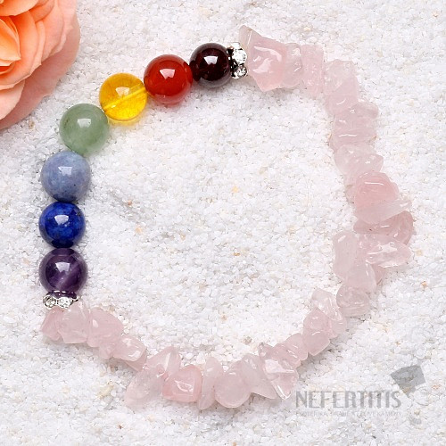 A chakra bracelet made of pieces of rose gold is said to bring love, suppress fear, anger and displeasure, and add vital energy. Seven beads made of semi-precious stones in the colors of all chakras are said to harmonize and recharge the energy of the chakras , body and mind. Bracelet diameter approx. 55 - 60 mm, on a rubber band.