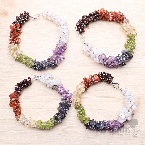 An exclusive and very attractive chakra bracelet made of hundreds of pieces of seven types of semi-precious stones in the colors of all chakras harmonizes and recharges the energy of the chakras, body and mind. Bracelet… more »