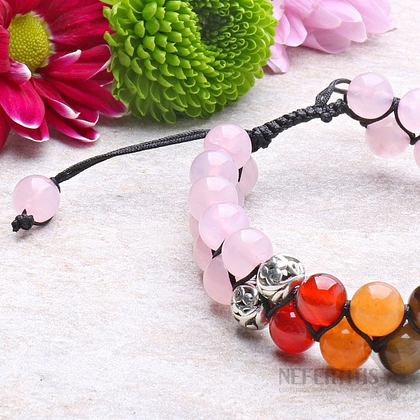 Beautiful double chakra bracelet made of natural rosewood beads with chakra beads and metal beads with traditional Tibetan patterns. Seven beads of semi-precious stones in the colors of all chakras harmonize and recharge the energy of the chakras, body and mind. Adjustable bracelet size with a sliding cord, finished with two rose gold beads. The great advantage of a bracelet with this fastening is its flexibility, when it is possible to stretch the bracelet up to a circumference of approx. 24 cm. Beads of approx. 8 mm are strung on a solid black cotton cord. Metal beads are made of base metal. Illustrative depiction of front material, color, shape and size of stones may differ from the accompanying photos. However, you will receive a bracelet of comparable quality.