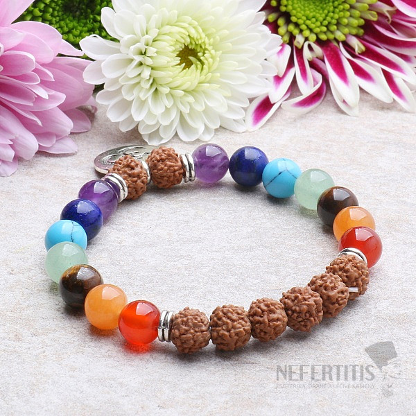 A beautiful rudraksha chakra bracelet with an Om pendant grounds , protects and balances the body, mind and spirit. It is a talisman of prosperity and wealth. Increases self-confidence. It brings peace and harmony. Seven beads in the colors of all chakras harmonize and recharge the energy of the chakras, body and mind. A metal pendant made of base metal in the color of silver - the syllable Om - is attached to the bracelet, so that the bracelet gives its wearer inner spiritual power, of which Om is the symbol. Beads of approx. 8 mm are strung on a high-quality white nylon rubber band. Metal beads are made of base metal. Illustrative depiction of front material, color, shape and size of stones may differ from the accompanying photos. However, you will receive a bracelet of comparable quality.
