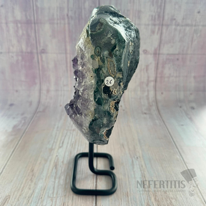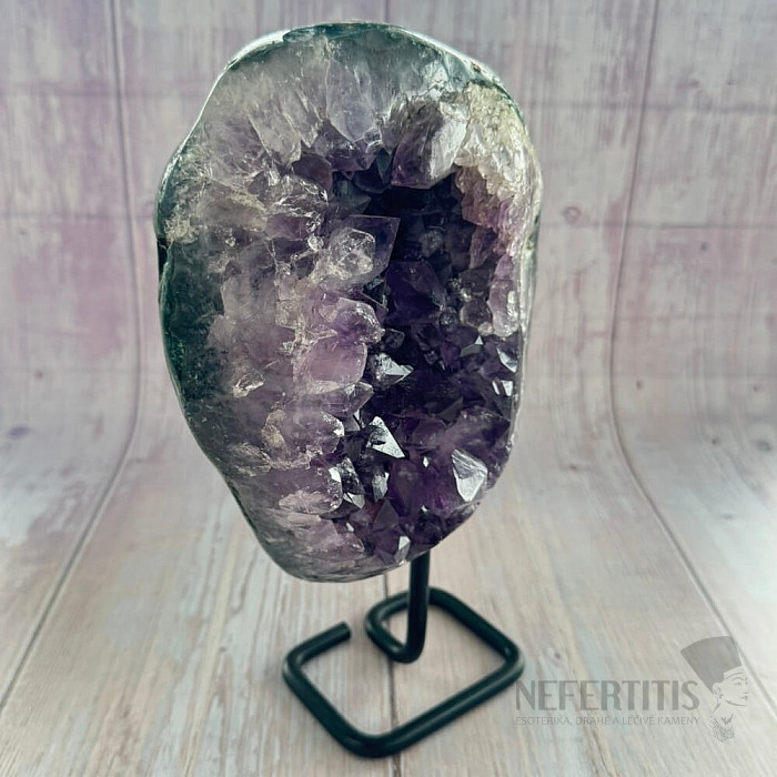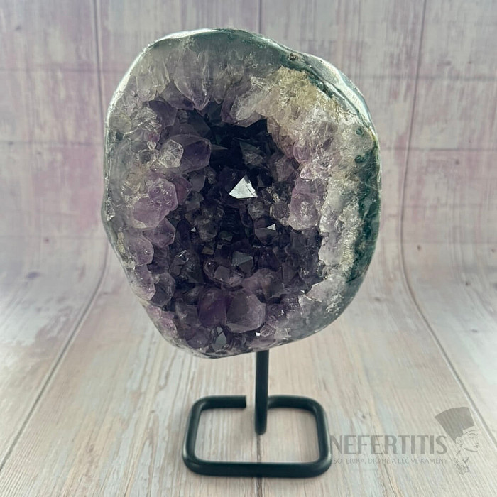 Amethyst druse of quality A on a metal stand. You are purchasing the exact piece shown. The stand may stain, so we recommend placing a mat under it and not placing it directly on furniture. Country of origin:… more »