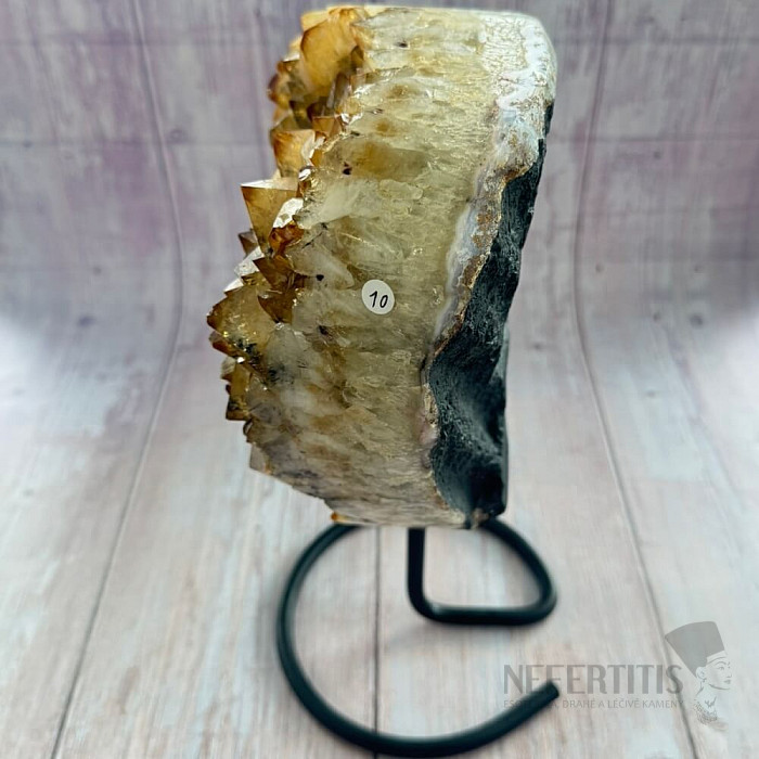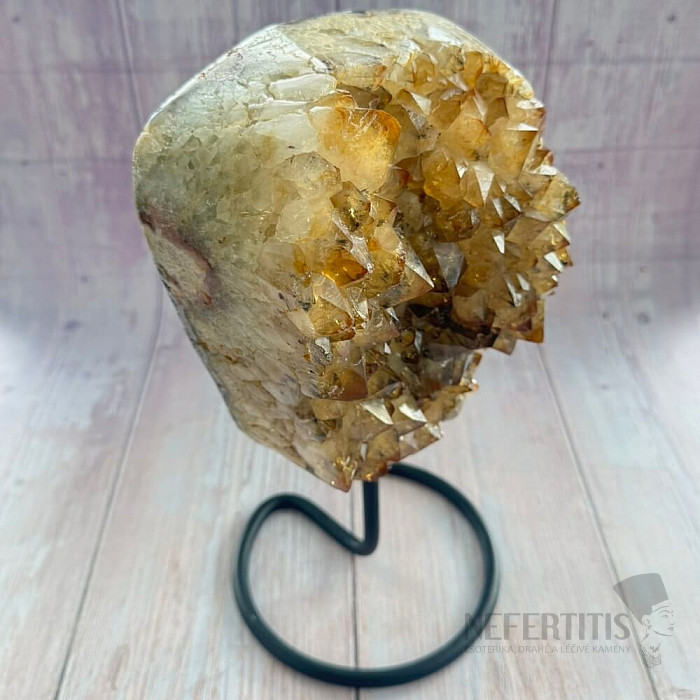 Polished citrine druse (burned amethyst) on a metal stand, A quality. Druses treated in this way are very rare. You are purchasing the exact piece shown. Country of origin: Uruguay Citrine is a traditional stone - a… more »
