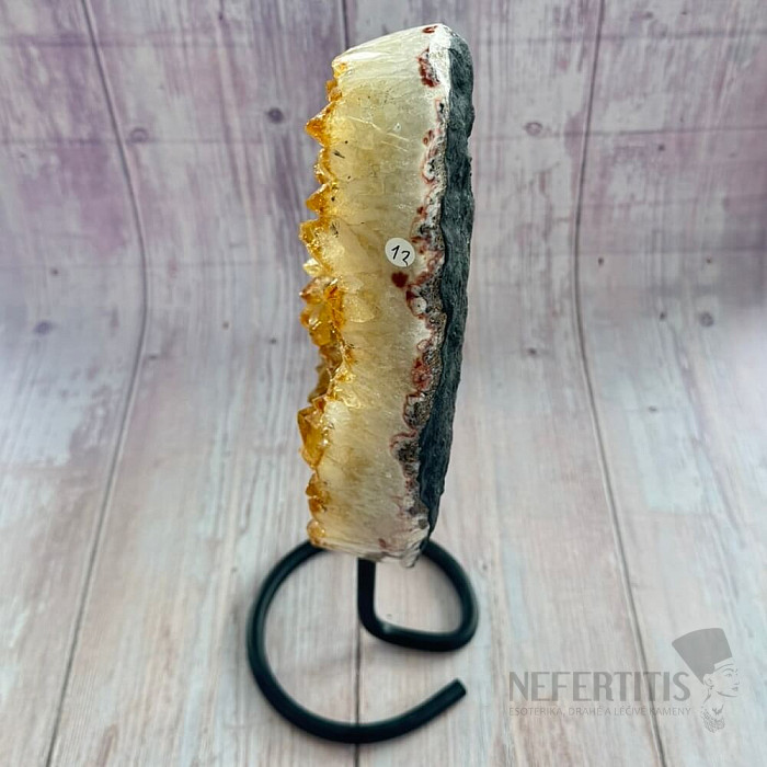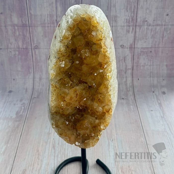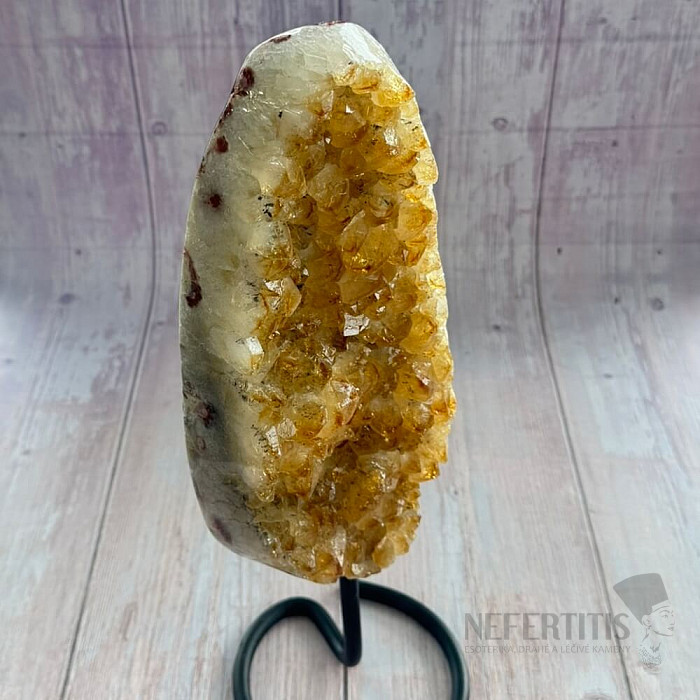 Polished citrine druse (burned amethyst) on a metal stand, A quality. Druses treated in this way are very rare. You are purchasing the exact piece shown. Country of origin: Uruguay Citrine is a traditional stone - a… more »