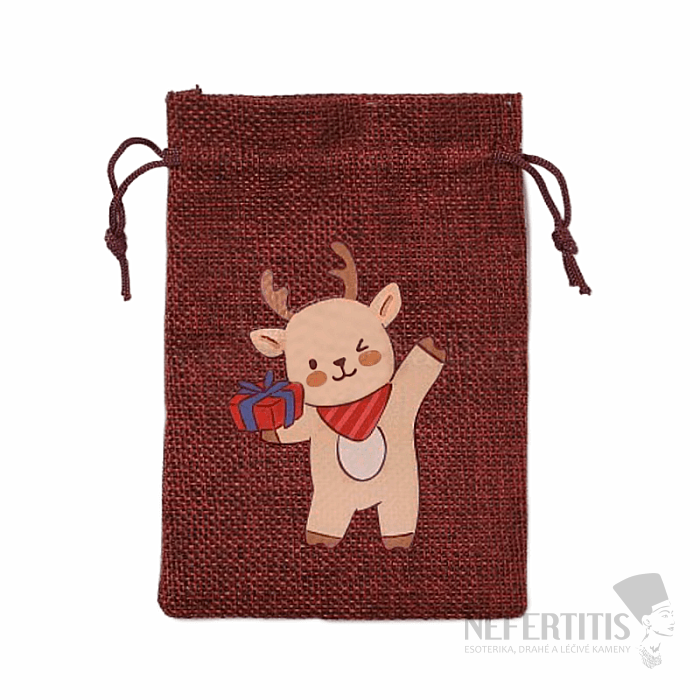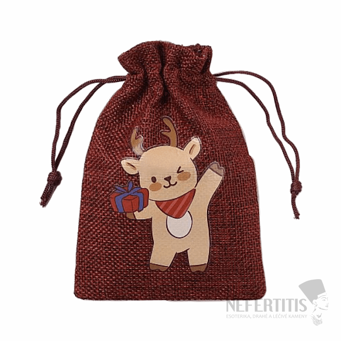 Jute tartan bag Christmas deer with gift with drawstring for storing small valuables, stones, jewelry and for attractive packaging and gifts for those you love. Gift bags and pouches are an easy and cheap alternative to gift boxes. Give your favorite small items, jewelry or stones comfort and protection inside this bag. Illustrative image.