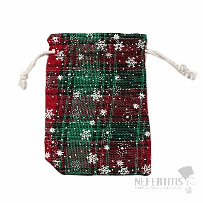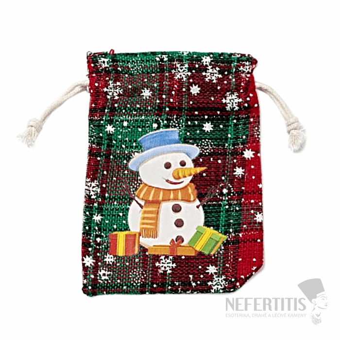 Jute tartan bag Snowman with drawstring for storing small valuables, stones, jewelry and for attractive packaging and gifts for those you love. Gift bags and pouches are an easy and cheap alternative to gift boxes. Give your favorite small items, jewelry or stones comfort and protection inside this bag. Illustrative image.