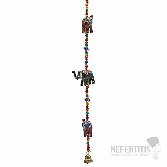 Feng Shui hanging decoration with wooden colored elephants and a bell. The decoration is made of wood, plastic and general metal. The total length of the decoration is approx. 80 cm. The decoration is also suitable for a children's room. Illustrative image.