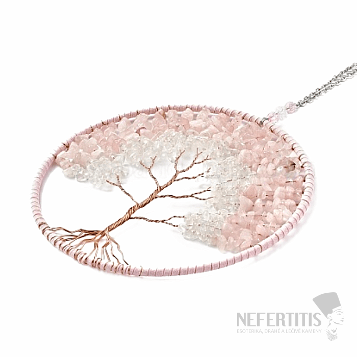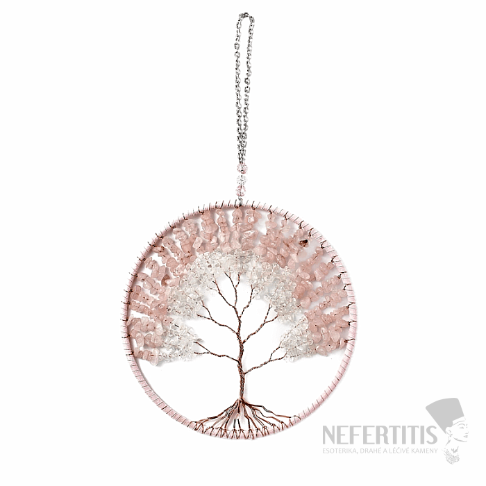 Feng Shui protective hanging Tree of Life made of rose quartz and crystal, suitable for home, office, winter garden or car. Use the hanging to suppress negative feelings, to support love and patience. Material: natural stone, metal, copper wire, synthetic beads, hanging length approx. 29 cm, circle diameter approx. 16 cm. Illustrative image. The size, structure of the stone, its pattern and color may vary slightly, but you will always receive a hanging of comparable quality.