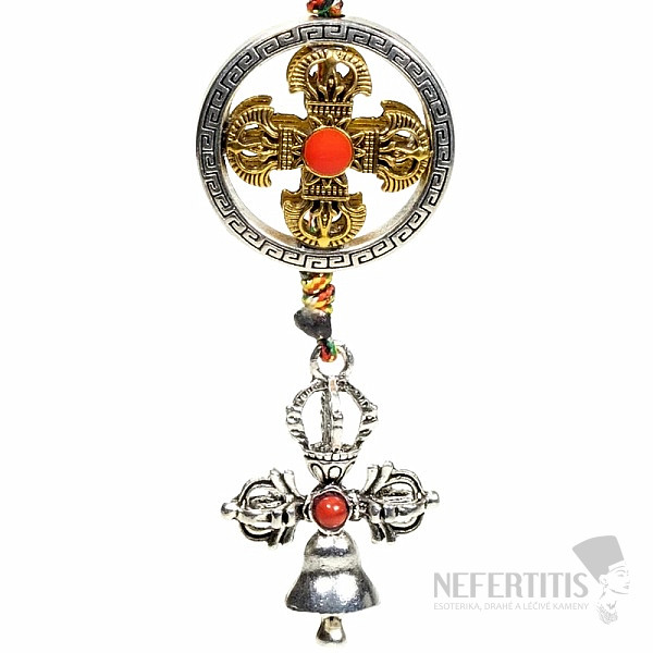Protective hanger with door and bell suitable for cars, homes, offices, keys or a handbag or backpack. Dorje represents a flash of enlightenment, a sudden change in human consciousness. Dorje is used to suppress ignorance. The bell symbolizes the attainment of wisdom and an understanding of emptiness. Total length about 20 cm, metal parts are made of base metal. Illustrative illustration.