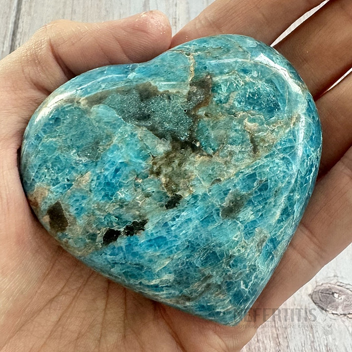 Polished heart-shaped apatite of premium quality. Country of origin: Madagascar. You are purchasing the heart pictured directly. You can buy stands and pedestals for minerals here. Blue apatite is a stone of… more »