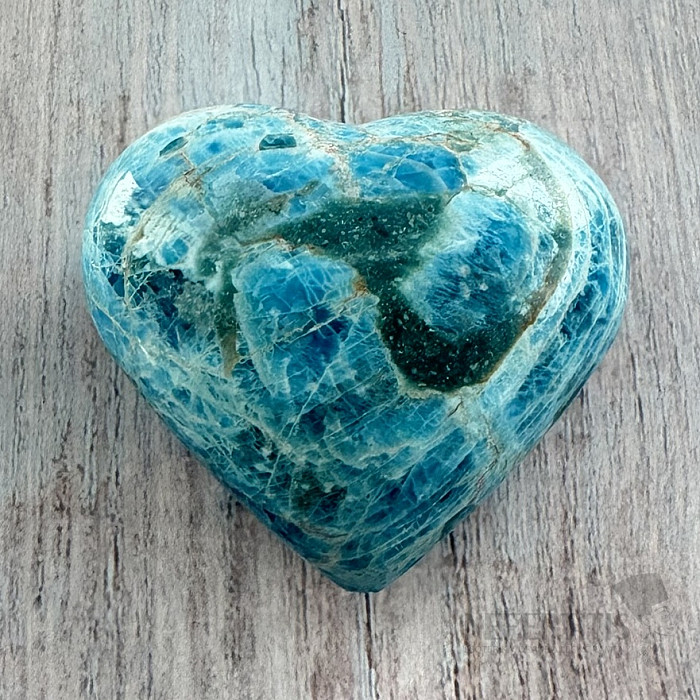 Polished heart-shaped apatite of premium quality. Country of origin: Madagascar. You are purchasing the heart pictured directly. You can buy stands and pedestals for minerals here. Blue apatite is a stone of… more »