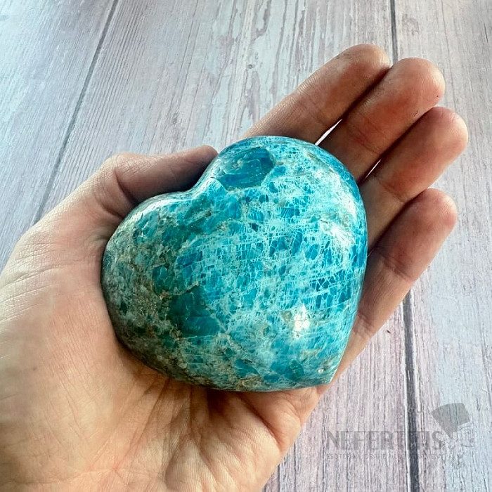 Blue apatite is a stone of intuition, communication and personal growth . It helps open the heart and mind, supports self-confidence and the courage to express one's own truth. Its energy connects spiritual perception with everyday reality and helps find inner balance. This heart made of apatite from Madagascar is not only a beautiful decorative piece, but also a protective talisman . It is suitable for meditation, supporting self-expression or as a gift for a loved one.