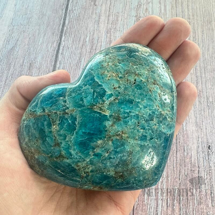 Polished heart-shaped apatite of premium quality. Country of origin: Madagascar. You are purchasing the heart pictured directly. You can buy stands and pedestals for minerals here. Blue apatite is a stone of… more »