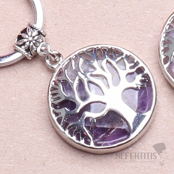 Beautiful natural polished amethyst chevron pendant key ring with metal tree of life . And chevron meth is a distinctive and handsome precious stone in which white and dark purple colors blend together in perfect harmony. Although this attractive type of amethyst is characterized by a non-uniform color and structure of the stone, where the white color often prevails over the purple, this key ring is a nice accessory that will not miss your keys anywhere. Silver-colored jewelry metal key ring. The size of the circle with the tree of life is approx. 2.5 cm, length approx. 6 cm.