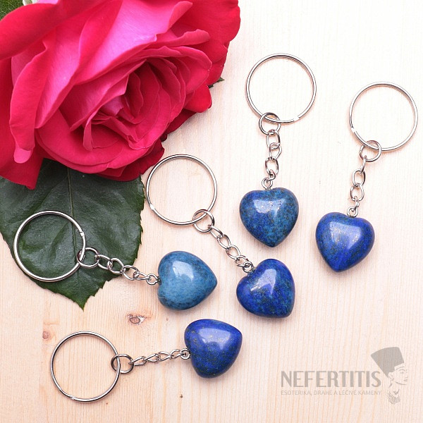 A beautiful key ring with a pendant made of natural lapis lazuli in the shape of a heart helps to suppress stress and tension, has an anti-depressant effect. A heart brings love, happiness and harmony in a partner relationship. Silver-colored key chain made of jewelry metal. Heart size approx. 2 cm. The total length of the key ring with the pendant is approx. 7 cm. Illustrative image, you are buying a natural piece of jewelry, therefore the shape, color shade, structure and pattern of the stone may differ from the official photos. The pendants are cut from large pieces of lapis lazuli, which is why they already show uneven coloration, which is a typical sign of natural lapis lazuli of this quality.