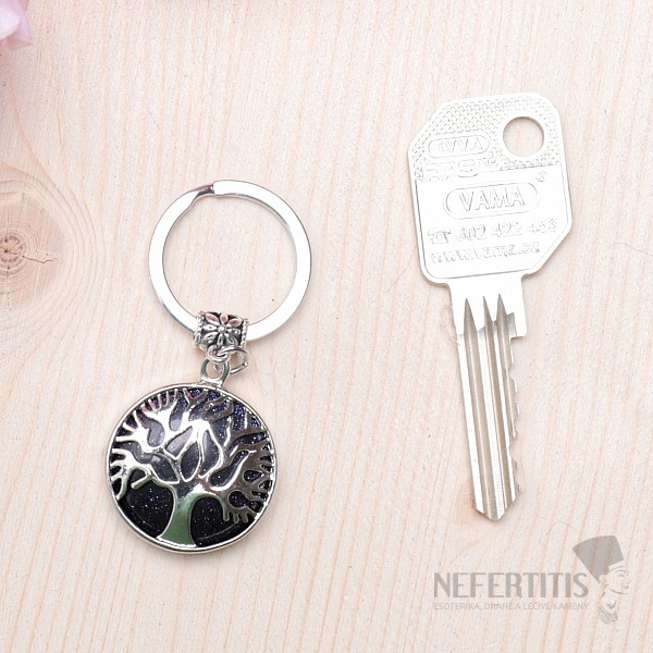 Keychain with blue aventurine and the Tree of Life, which is a strong protective symbol for vitality, energy and vitality. Keep your favorite stone with you at all times in the form of a beautiful key ring. The size of the circle with the tree of life is about 2.5 cm, the length is about 6 cm. Made of silvery jewelry metal. Illustrative illustration.