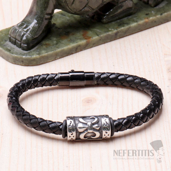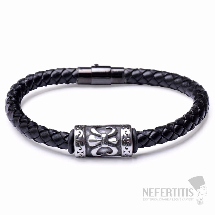 Fashion men's black leather bracelet with stainless steel ornament. Bracelet width approx. 0.6 cm, circumference bracelet is about 20 cm, magnetic closure, stainless steel according to DIN 1.4301 (AISI 304). Therefore, we strongly recommend that you measure the circumference of your wrist before purchasing. Illustrative illustration.