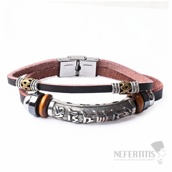 Modern men's bracelet made of brown leather with hematite and elegant decorative metal elements. The central metal bead bears the most famous of all mantras "Om Mani Padme Hum". A beautiful piece of jewelry that combines current trends with the iconic tradition of the Far East. The metal buckle is made of steel, the other metal elements are made of base metal. Uniqueness, change, self-confidence, self-expression, that's exactly what this bracelet is all about. The circumference is approx. 22 cm. We therefore strongly recommend measuring your wrist circumference before purchasing.