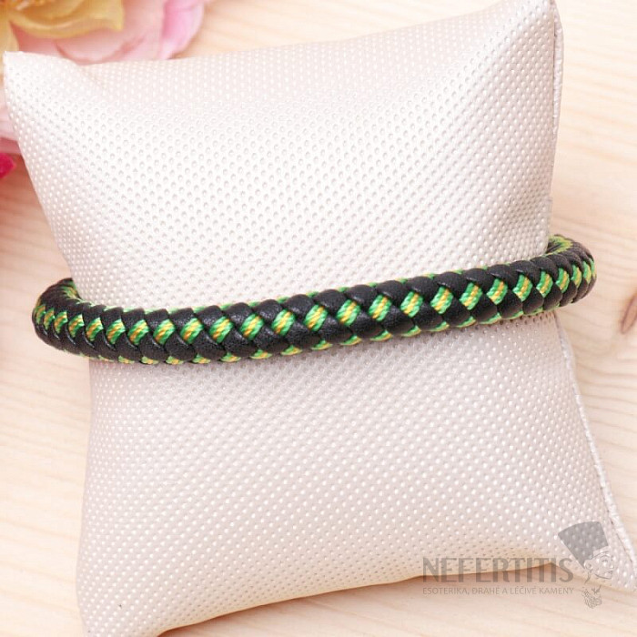 Fashion men's bracelet made of synthetic leather with a stainless steel magnetic clasp. The bracelet is knitted from black leather and green-yellow microfiber. Bracelet width approx. 0.8 cm, circumference bracelet is approx. 21 cm, magnetic closure, stainless steel according to DIN 1.4301 (AISI 304). We strongly recommend measuring your wrist circumference before purchasing. Illustrative image.