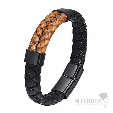 Fashionable men's bracelet made of braided leather with a regular geometric pattern in two colors - black and brown. Bracelet width approx. 1.2 cm, circumference The bracelet is approximately 21.5 cm long, with a sliding magnetic clasp made of base metal with a black lacquer finish. We strongly recommend measuring your wrist circumference before purchasing. Illustrative image.