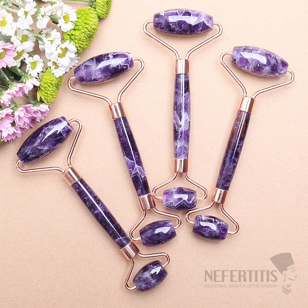 Double-sided amethyst massage roller . The larger roller, also known as the face roller, is used to massage the limbs and back, the smaller roller is used to massage the face. At first, the cool touch of the stone has a… more »