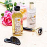 Set of double-sided massage roller made of magnetic hematite with a handle made of black agate and heart-shaped gua sha made of hematite. The larger roller, also known as the face roller, is used to massage the limbs… more »