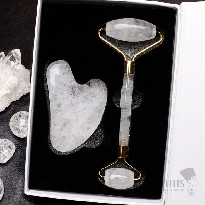 Double-sided massage roller and gua sha set in a heart shape made of crystal in a gift box. The larger roller is intended for massaging the limbs and back, the smaller roller is used for facial massage. At first, the cool touch of the stone has a really nice feeling on the skin, it will serve to relieve headaches or the feeling of heavy eyelids after waking up in the morning, and after a while of massaging it will reward you with a warm warmth. The roller can be used on dry skin, or through it we can apply creams, ointments and oils, e.g. using the Gua sha technique. Gua sha is intended for massaging the face, back, neck and fingers. The massager can be used both alone and during partner massage. Thanks to the beautiful feelings that their use causes, you can use them at any time to spend beautiful moments, and not only when you are in pain. Illustrative representation of natural material, where the color and structure of the stone may differ from the accompanying photos. However, you will always receive massagers of comparable quality.