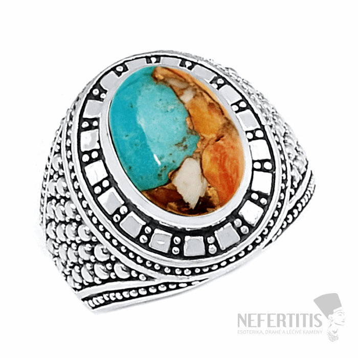 This massive men's silver ring is a precisely handmade piece of jewelry that combines traditional decoration with modern materials. It is made of 925/1000 sterling silver and set with an oval cabochon of Spiny Oyster turquoise measuring approximately 15 mm . The weight of the ring is approximately 12 g , which gives it expressiveness, strength and a sense of luxury. Illustrative image.