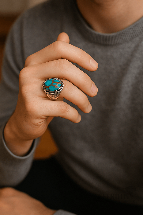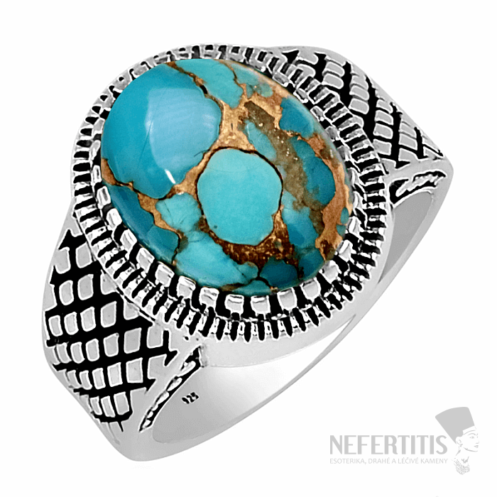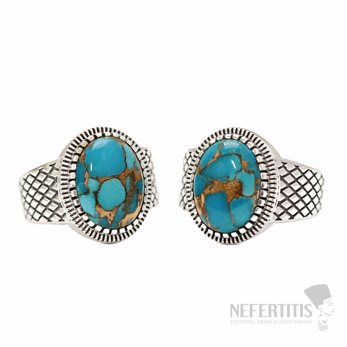 The stone is made of pieces of natural turquoise connected with copper , which gives it a unique mosaic pattern with a contrast of turquoise blue and brownish veins. The ring's rim is decorated with an engraved pattern resembling a checkerboard , which gives the jewelry a modern and traditional character at the same time.