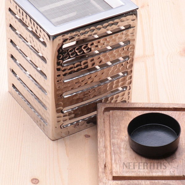 Suniel - metal oven in a modern design with a mango wood base for a tea candle. The oven is mainly used for burning on carbon, for burning all types of fumigants, ie herbs, fragrant woods, resins, fumigation mixtures… more »