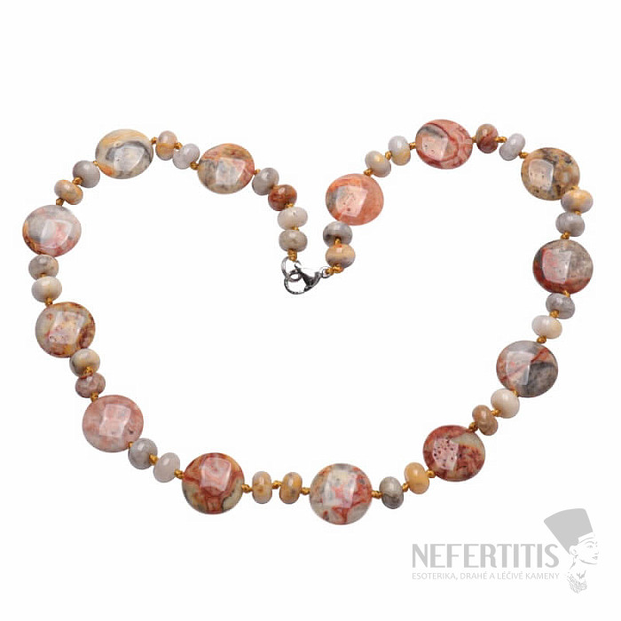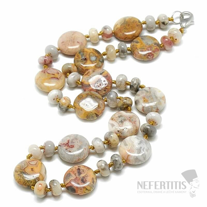 Attractive Crazy Agate necklace made of various bead shapes. Crazy agate necklace for everyday and unusual days. Underline your elegance and uniqueness. The length of the necklace is approx. 46 cm, bijou clasp made of base metal, size of beads approx. 1.6 and 0.8 cm. Illustrative image , individual necklaces may differ from it mainly in color shade, structure and pattern of the stone.