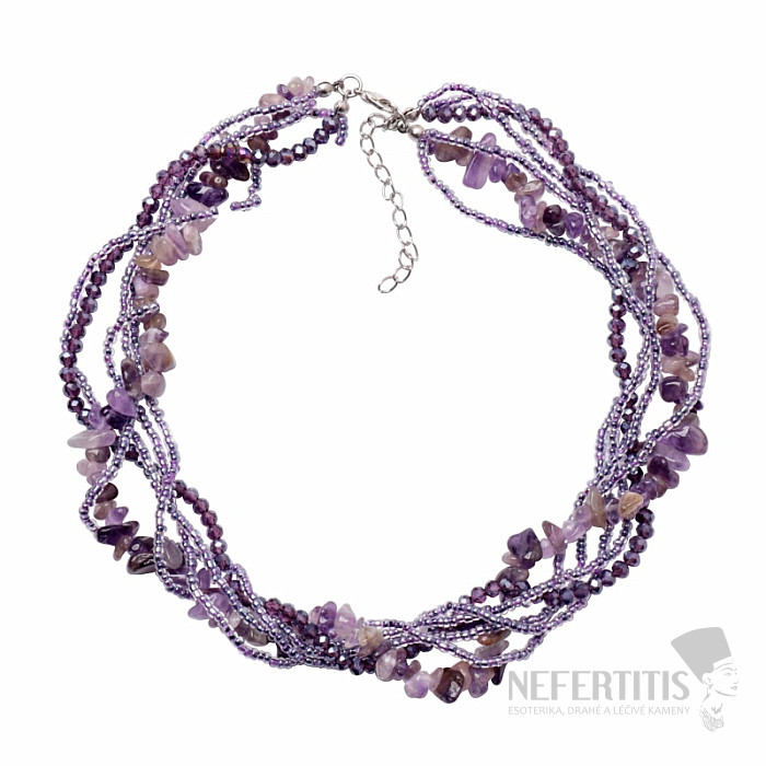 Dazzling purple tone necklace with shimmering Svarowski style beads, seed beads with purple polished amethyst pieces. The six strands of this charming necklace ignite geysers when the light hits them shimmering play of light on the edges of plated cut crystal glass beads. Strands of amethyst stones are a talisman of passion, love and understanding. A truly unmissable and attractive fashion accessory. Bijouterie fastening made of base metal, necklace length approx. 42 cm, thanks to the extension chain up to approx. 47 cm. Illustrative image.