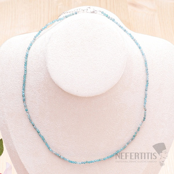A necklace of cut apatite beads. Thanks to hundreds of cut surfaces, the necklace sparkles beautifully and is the perfect accessory for various occasions. Beads size approx. 1.9 mm, stainless steel jewelry clasp, base metal chain. Illustrative image, you are buying a natural product, therefore individual necklaces may differ from it mainly in color shade, luster and stone pattern. However, you will always receive a necklace of comparable quality.