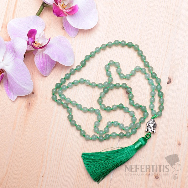 An elegant necklace made of aventurine beads, with the head of Buddha. An attractive and unmissable piece of jewelry. The diameter of the beads is approx. 6 mm, the metal Buddha head is made of base metal, the length of the necklace is approx. 80 cm without the tassel. Illustrative image, you are buying a natural product, therefore individual necklaces may differ from it mainly in color shade, luster and stone pattern. However, you will always receive a necklace of comparable quality.