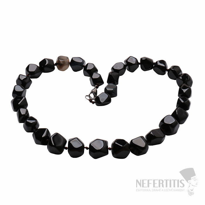 Exclusive necklace made of large nuggets of black agate. Size of the nuggets approx. 1.4 to 1.6 cm, costume jewelry fastening, metal parts made of base metal, each nugget is secured with a knot. The length of the necklace is approx. 51 cm. Illustrative image, you are buying a natural product, therefore individual necklaces may differ from it, especially in color shade, shine and possibly stone pattern. However, you will always receive a necklace of comparable quality.