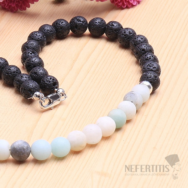 An elegant necklace made of natural lava stone beads and satin amazonite. An attractive and unmissable jewel. The diameter of the lava stone beads is approx. 8.6 mm, the diameter of the amazonite beads is approx. 7.8 mm, the length of the necklace is approx. 45 cm, jewelry clasp, the metal beads are made of base metal. Illustrative image, you are buying a natural product, therefore individual necklaces may differ from it mainly in color shade, luster and stone pattern. However, you will always receive a necklace of comparable quality.