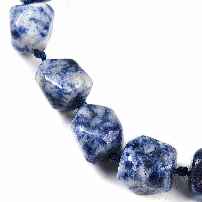Luxurious necklace made of large quartz nuggets with sodalite. Necklace length approx. 51 cm, costume jewelry fastening, bead size approx. 1.1 to 1.5 cm, each nugget is secured with a knot. Illustrative image, you are buying a natural product, therefore individual necklaces may differ from it, especially in the color shade and pattern of the stone. However, you will always receive a necklace of comparable quality.