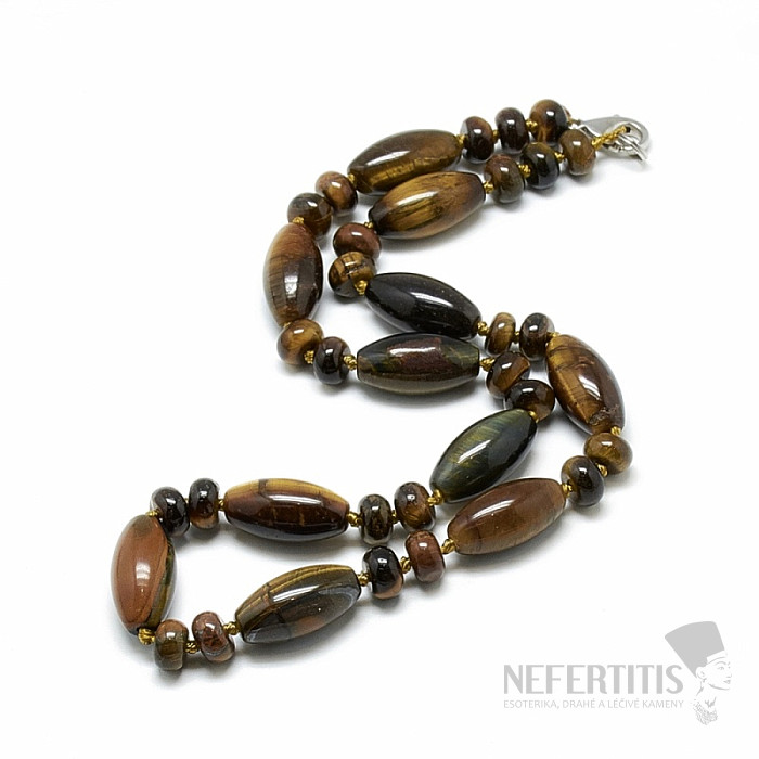 A necklace made of tiger eye beads, which protects its wearer, strengthens will power, brings prosperity and happiness. Suppresses depression, gives strength. Jewelery fastening, necklace length approx. 42 cm, bead size approx. 0.5 and 2 cm. Illustrative image, you are buying a natural product, therefore individual necklaces may differ from it mainly in color shade, luster and stone pattern. However, you will always receive a necklace of comparable quality.