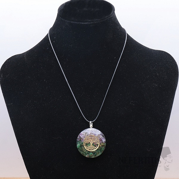 Orgonite beautiful pendant in the shape of a circle with natural amethyst and green aventurine with the Tree of Life. The Tree of Life is a strong symbol that supposedly gives its bearer vitality, energy and vitality . It is generally said that orgonite is said to suppress electromagnetic radiation and neutralize the negative effects around it. Handle made of silver jewelery metal. The orgonite symbol of the Tree of Life is made of jewelery metal of golden color. Pendant size approx. 4 cm, pendant thickness approx. 1 cm. We supply the pendant including a waxed cotton cord with jewelery fastening with a length of approx. 44 to 49 cm thanks to an extension chain. Illustrative depiction of the product made of natural material, the composition of the stones in orgonite, their shape and color may differ from the accompanying photographs.