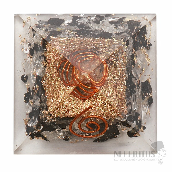 A beautiful orgonite in the form of a pyramid with pieces of natural crystal and black tourmaline skoryl and a copper spiral tardily to increase the positive energy in the space where this orgonite pyramid is placed. It charms with its mysterious elegance thanks to the combination of black tourmaline and light crystal.